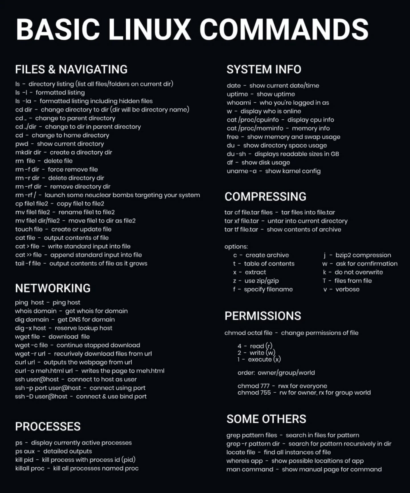 Here’s a list of all the basic Linux commands from the image you provided, grouped by category:FILES & NAVIGATING